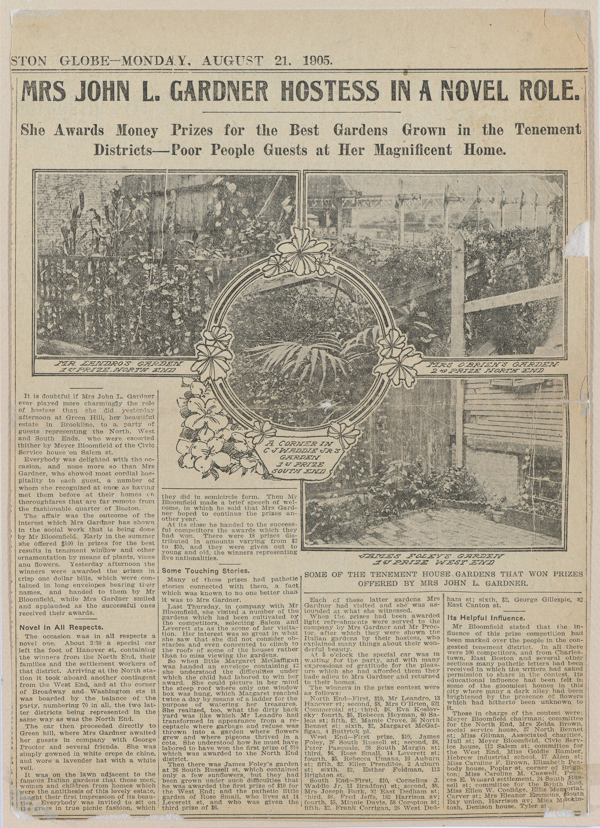 Inspired by the City Beautiful movement to beautify urban areas during the turn of the 20th century, the city of Boston created competions for city residents to create the most impressive window boxes and gardens in their neighborhoods. This 1905 Boston Globe article highlights Isabella’s role of sponsoring the prizes and hosting the winners at her own extensive gardens at her home in Brookline, Massachusetts called Green Hill.