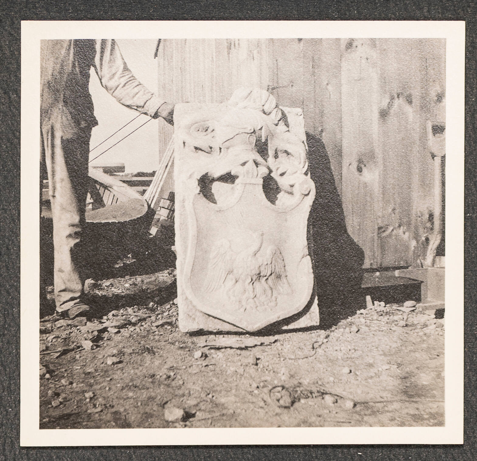 Isabella Stewart Gardner asked her friend, artist Sarah Wyman Whitman to design this distinctive crest bearing a phoenix rising from the ashes, an emblem of immortality, and the phrase C’est Mon Plaisir (It’s My Pleasure), one of Isabella's mottoes. Isabella took this photograph of the sandstone crest before it was installed above the museum’s former entryway on the north side of the building, where it continues to greet visitors today.