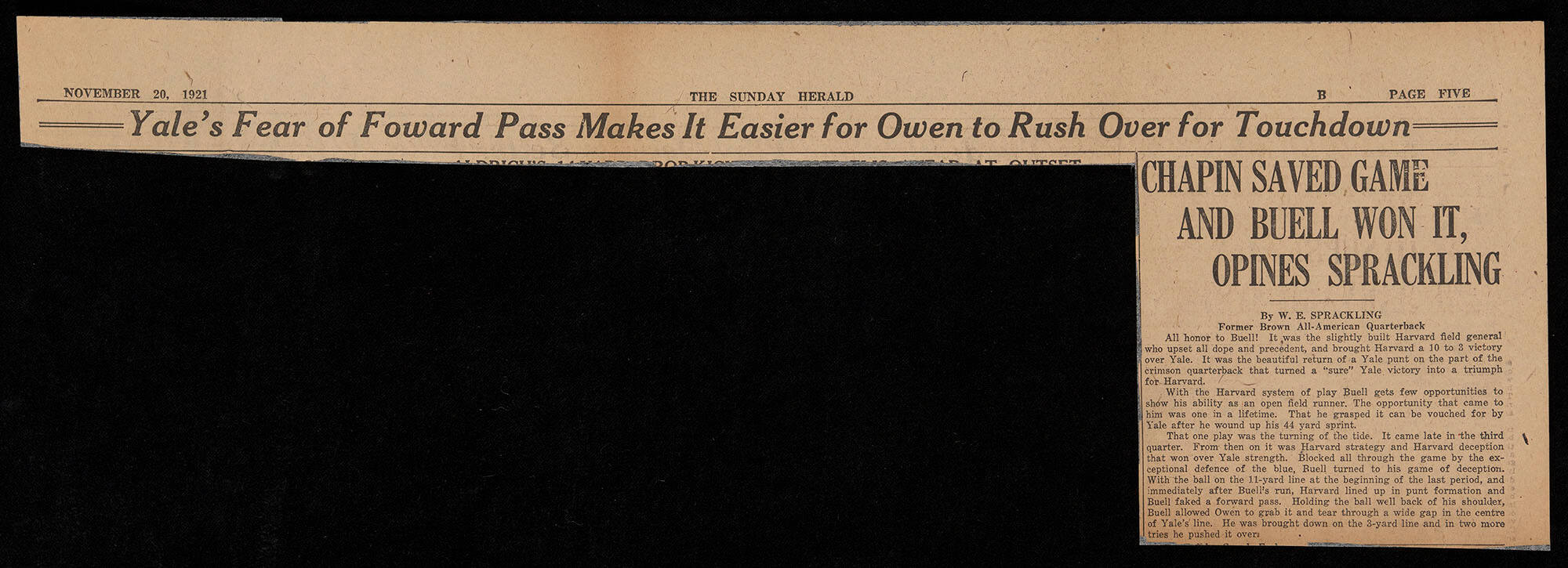 "Yale's Fear of Forward Pass Makes it Easier for Owen to Rush Over for Touchdown: Chapin Saved Game and Buell Won it, Opines Sprackling"