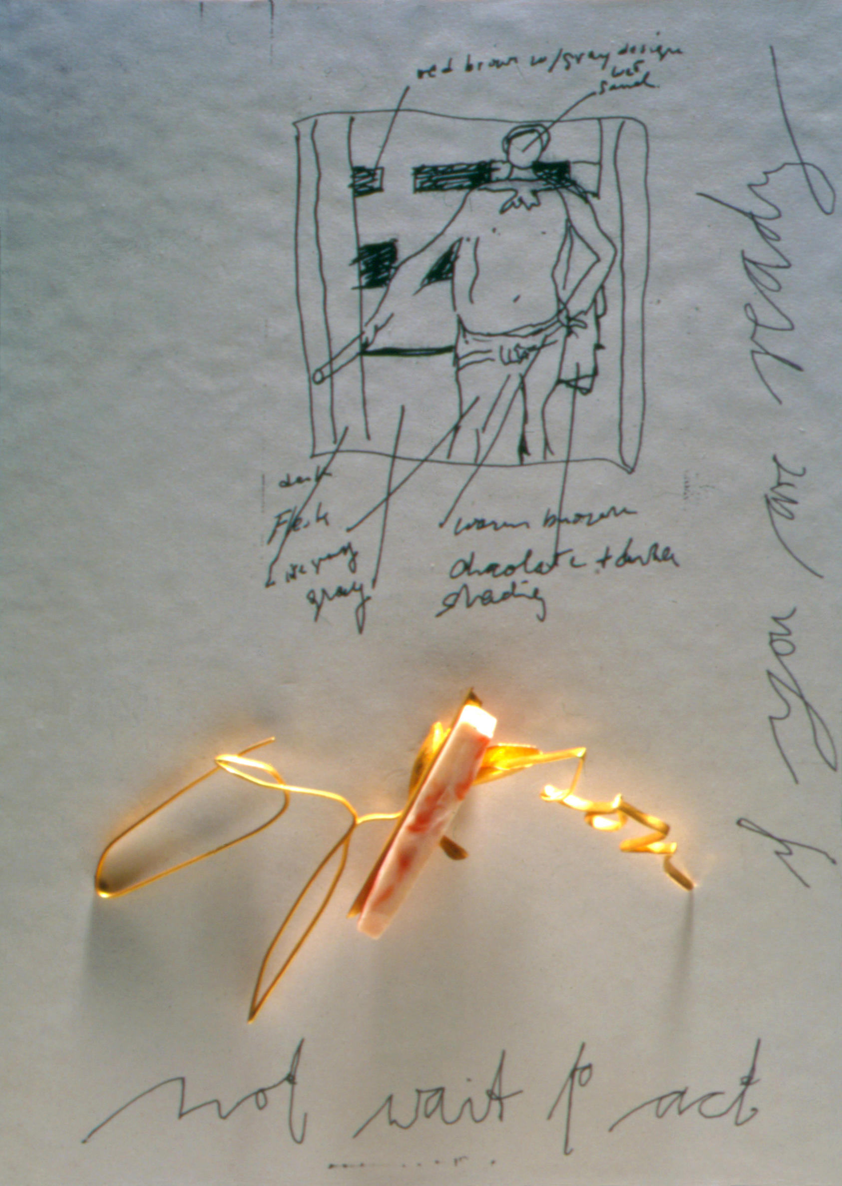 Bischoff particularly responded to Piero della Francesca's Hercules in the Early Italian Room and to records about the fresco’s conservation treatment in 1999. Or-Son, a brooch in fine gold and expensive coral captured the essence of Piero's Hercules with its qualities of beauty, movement, and grace. On the mounting board, Bischoff copied a simple drawing taken from the conservation records, and painted sweeping brush strokes in red and pink paint that emulated the imminent motion of Hercules’ club.