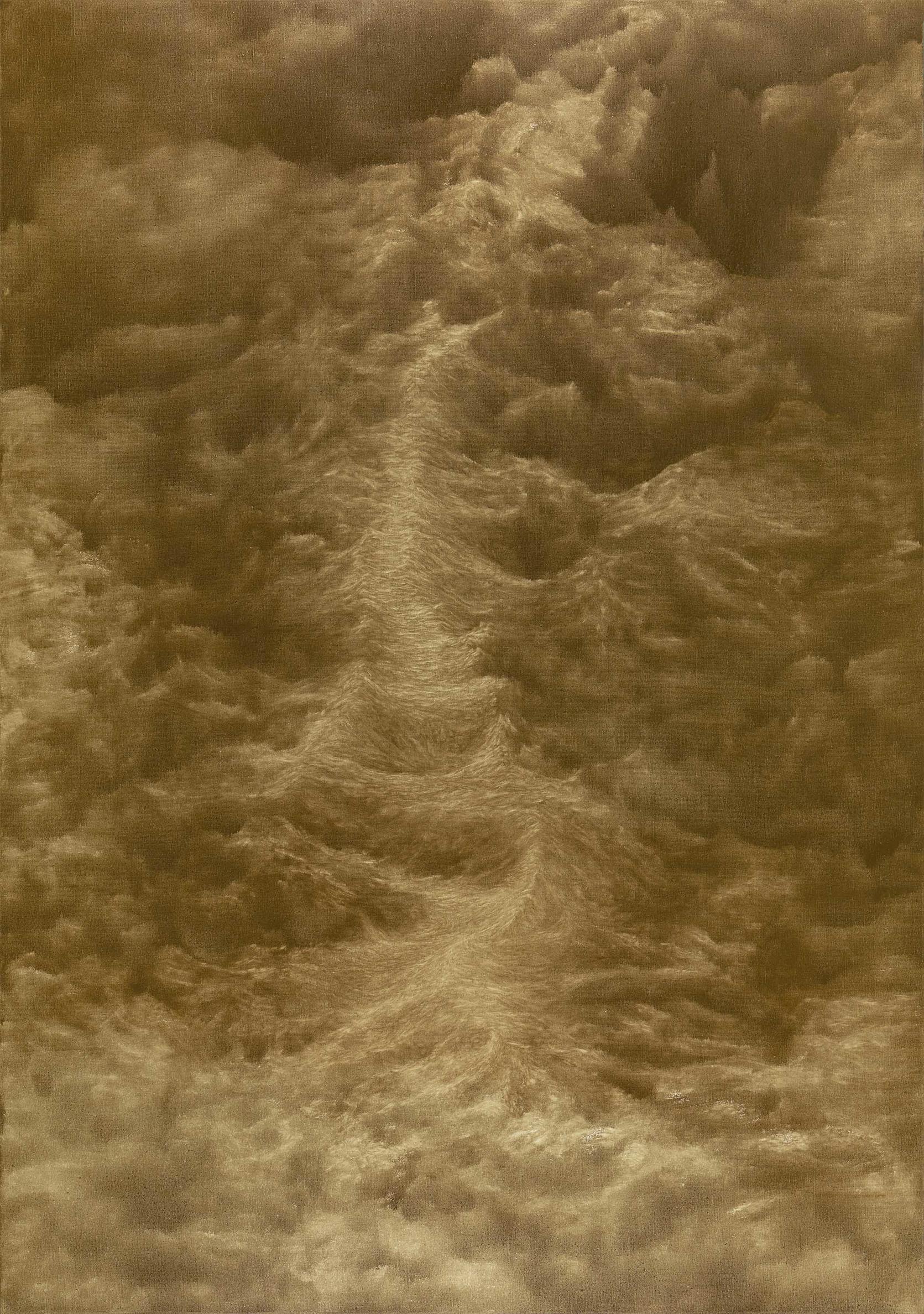 沈伟利用不同绘画材料,包括油彩、丙烯和墨等,以及笔触和流滴等技巧间的互动,创造出令人联想到自然元素中不断变化的形态。 山形之间的虚白空间缔造了一刻宁静的停顿,但这也使我们质疑我们所看到的东西—到底这是透过云层看到的遥远风景,还是某些神话人物的扭曲身体呢?