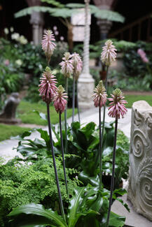 These winter-flowering deciduous bulbs boast tubular blooms of pastel pink and yellow. The glossy foliage dies back in the summer. Gardner Museum horticulturists encourage the bulbs’ dormancy after flowering by gradually reducing watering, allowing them to dry down for storage in a dry, dark place. In the fall, we return the bulbs to the greenhouses and gradually increase watering. Because Veltheimia thrives in semi-shaded forest understory, it fares well in the Courtyard along with the many other South African natives in the living collection.