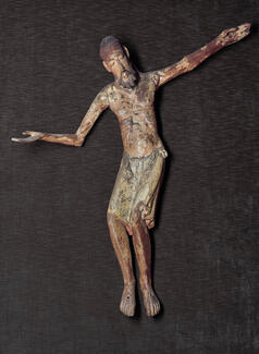 This immensely moving image, with remnants of original pigment visible in the beard, eyes, and loin cloth, has taken on even greater pathos through centuries of wear and damage, which echo Christ’s suffering on the cross.