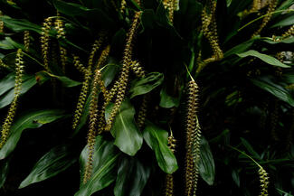Dendrochilum magnumDendrochilum’s common name comes from its flowers. With long ropes of golden blooms draping through strappy foliage, golden chain orchids fill the Courtyard’s cloisters with a warm clove scent.